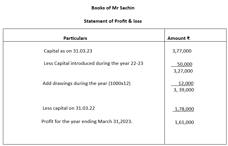During the year 2022-2023, he introduced ₹50,000 as additional capital and withdrew ₹1,000 per month for his personal use. Ascertain his profit for the year ending March 31, 2023.