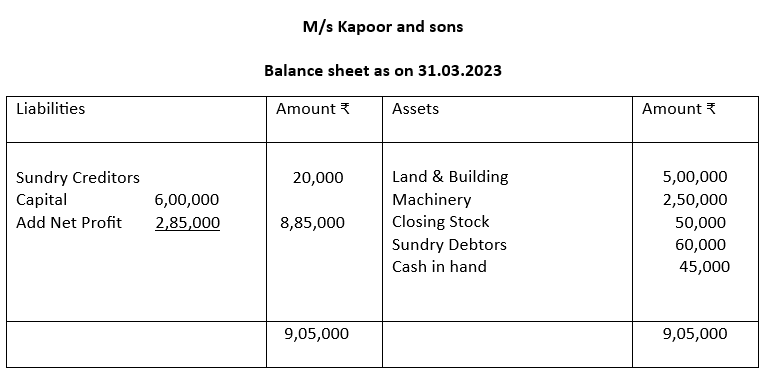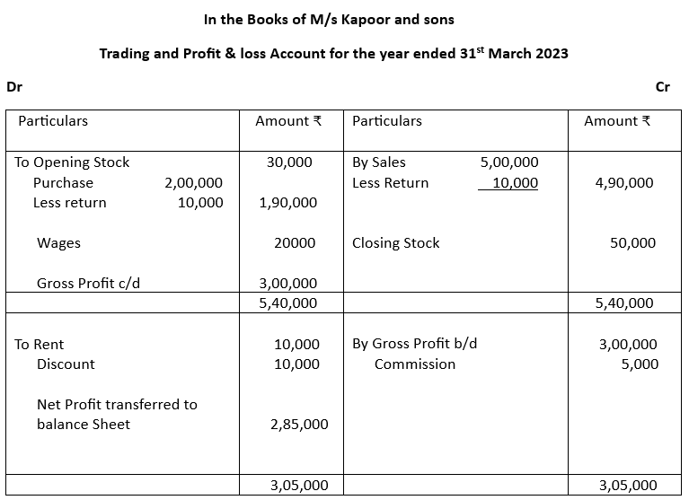 4. Prepare Trading Account, Profit & Loss Account and Balance sheet for M/s Kapoor and sons from the following information for the year ending 31st March 2023 when closing stock is valued at