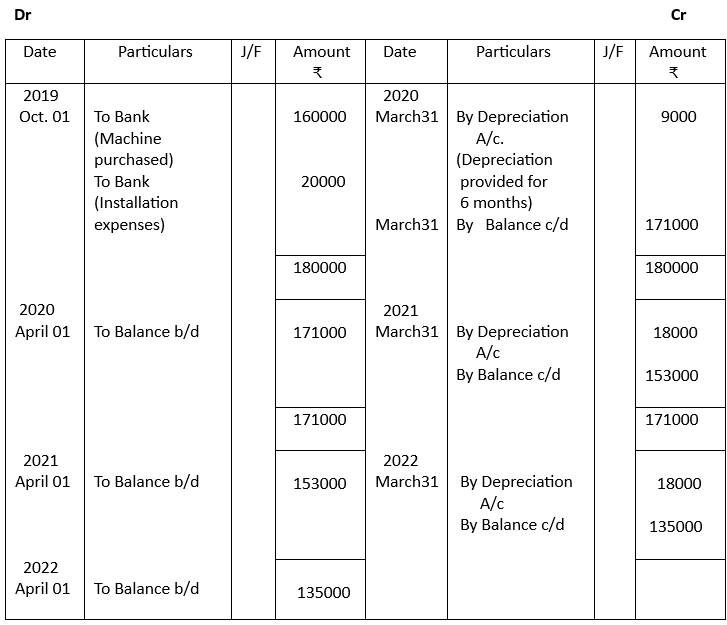 M/s. Goenka Bros. acquired a machine for ₹160000 on October 1, 2019 and spent ₹20000 on its installation. The firm writes off depreciation @10% p.a. on original cost every year. Record necessary journal entries and draw up Machine Account and Depreciation Account for the first three years assuming that the firm charges