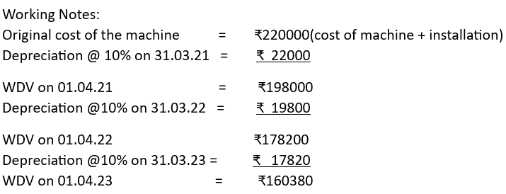 M/s. Rajesh Oil Mills purchased machinery on April 01,2020 for ₹200000 on credit from M/s. Metal Mart and spent ₹20000 for its installation. Depreciation is provided @10% on Diminishing Balance method basis. Prepare Machinery A/c for three years assuming books are closed on 31st March every year.