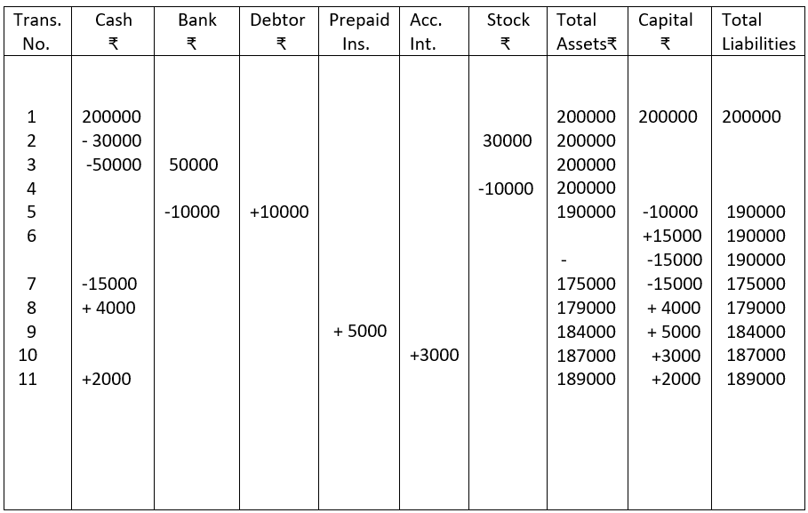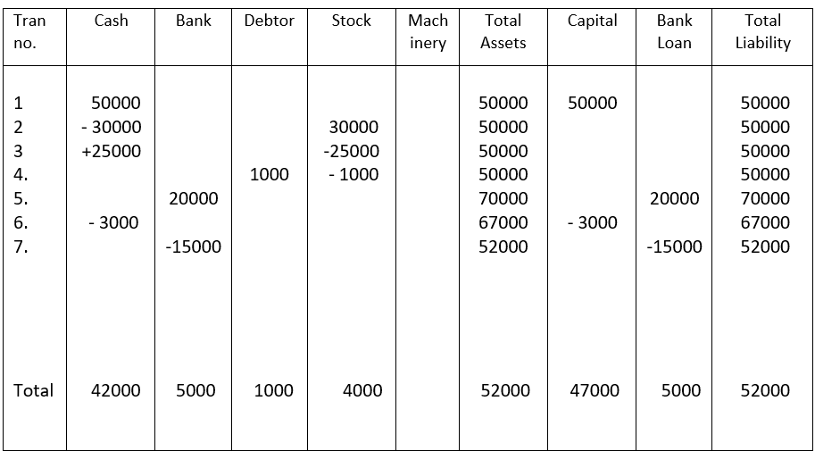 Assets ₹50000 – ₹ 10000 (cash) + ₹ 10000 (Printer) = Liabilities ₹ 50000 or
