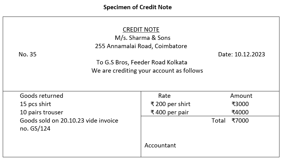 6. Credit Note: This document is issued by a seller to a buyer as an acknowledgement of goods returned by the buyer. A Credit Note is issued to credit a buyer’s account to transfer money for goods returned. Transaction: M/S. G.S Bros. returns goods worth ₹7000 to M/s. Sharma & Sons for poor quality.