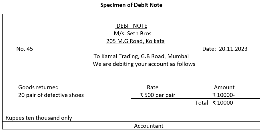 5. Debit note: This is a document sent by a buyer to a seller when a part of the goods is not up to the mark, and the buyer chooses to return them. A note is prepared to debit the supplier account. It is called a Debit Note and is raised to reduce the amount payable to the seller. A Debit Note is made in duplicate, the original copy is sent to the supplier and the duplicate copy is retained for future reference.