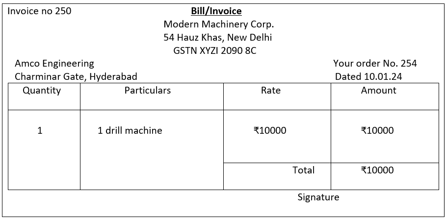 The Source document: Bill/Invoice no.250 issued by Modern Machinery