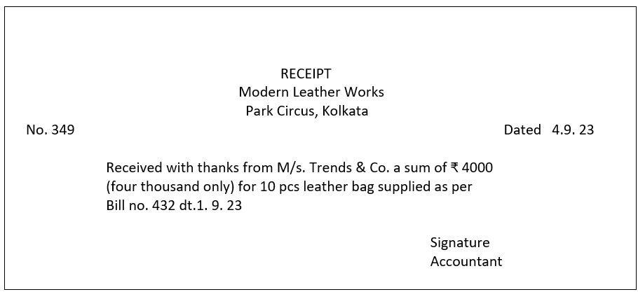 Transaction: Modern Leather Works sold 10 leather bags to Trends & Co. for ₹ 4000