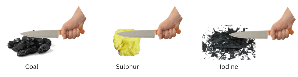 (ii) Coal cannot be cut with a knife, whereas sulphur and iodine can be cut easily with a knife.