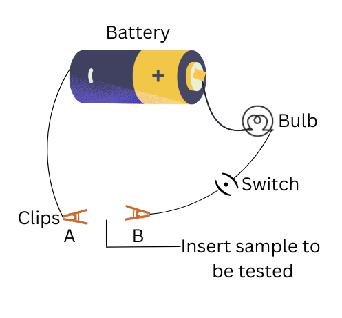 Materials Required: Carbon (coal or graphite), sulphur and iodine, sand paper, knife, hammer, battery, bulb, switch, electric wires, clips.