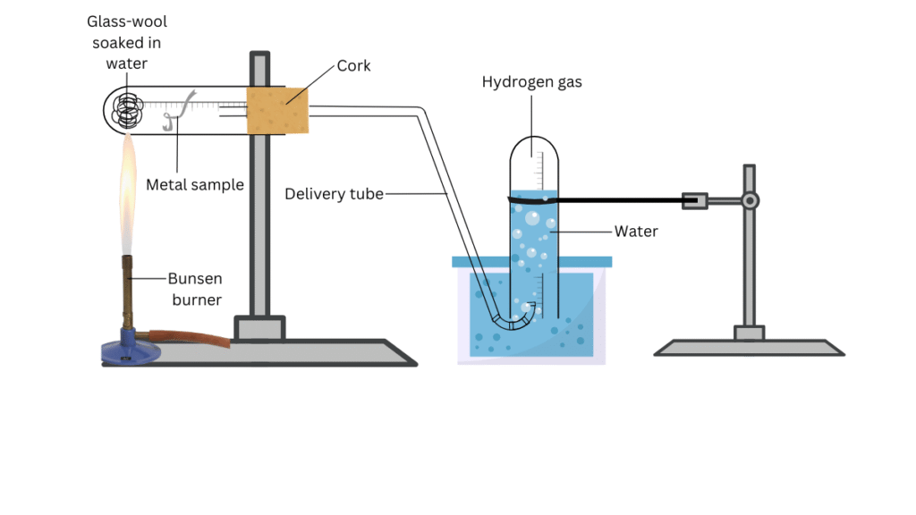 Materials Required: Sodium, calcium, magnesium, aluminium, zinc, iron, copper, lead, beakers, cold water, hot water, beakers, two laboratory stands, two glass tubes, glass wool soaked in water, cork, delivery tube.