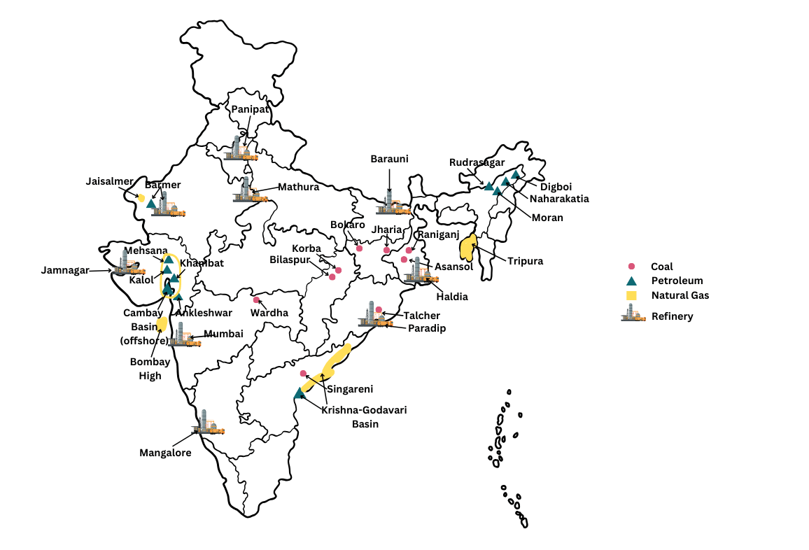 The places where coal, petroleum, natural gas and petroleum refineries in India are located are shown below in the outline map of India: