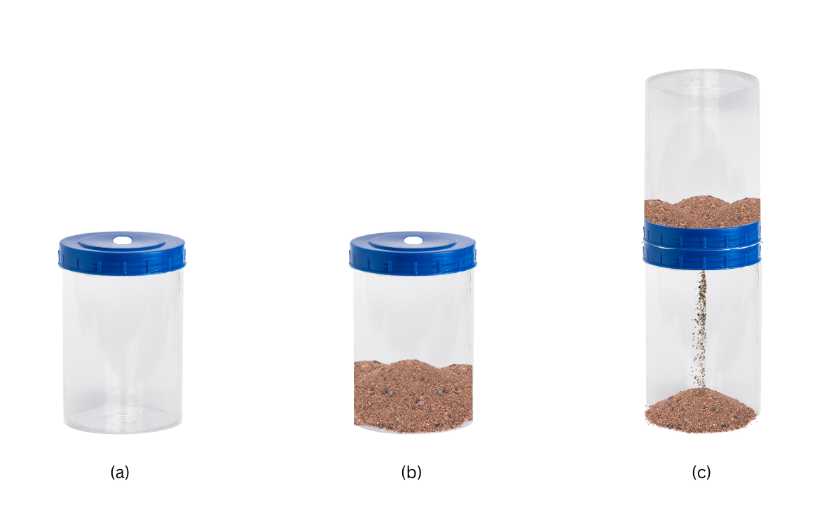- You will see the sand flowing out from the upper can to the lower can as shown in Figure (c).