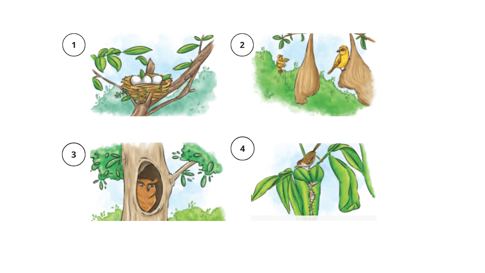 2. Look at the different kinds of nests and homes the birds make. Have you seen any? Discuss these types of nests with your teacher and classmates.