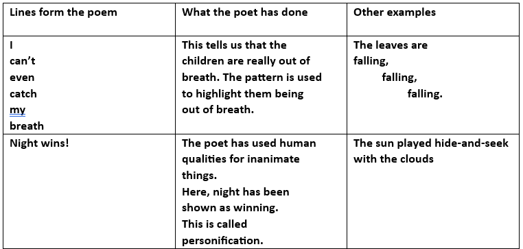 1. Read the information given in the table and see what the poet has done in the poem ‘The Winner’.