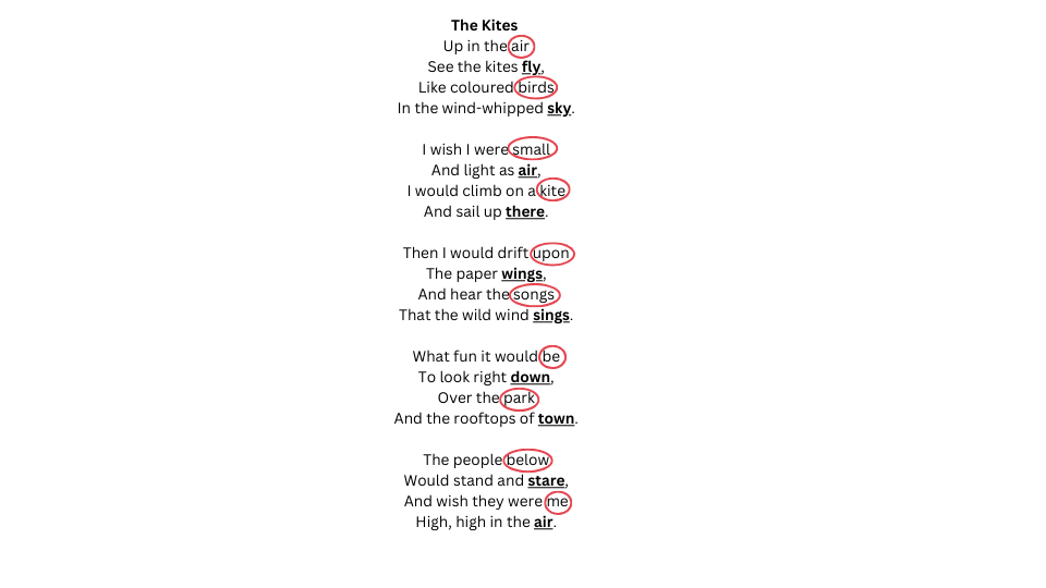 5. Study each stanza and underline the rhyming words from the end of each line. Also, circle the end words in the stanzas that do not rhyme.