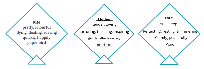 The poet uses simile in (a) and (b) to compare the kites with coloured birds and the quality of being light as air. The poet uses ‘like’ and ‘as’ to compare. |