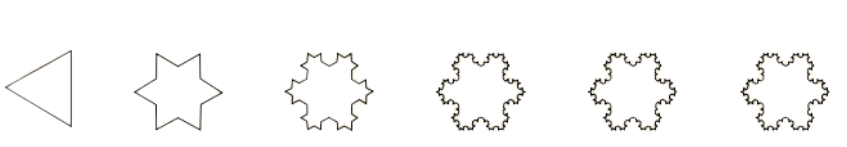 Koch Snowflake: Each line segment in each shape bends to form one triangle as the sequence progresses.