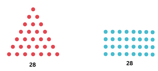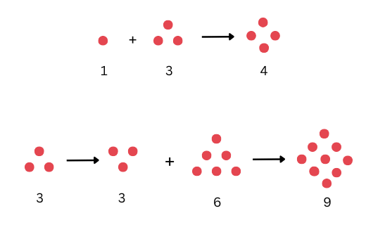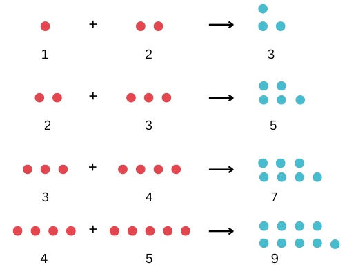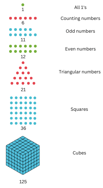 1, 3, 6, 10, 15, 21, 28, … (Triangular numbers) | Triangular numbers are numbers you get by adding up dots to form a triangle: 1, 3 (1+2), 6 (1+2+3), 10 (1+2+3+4), and so on! |