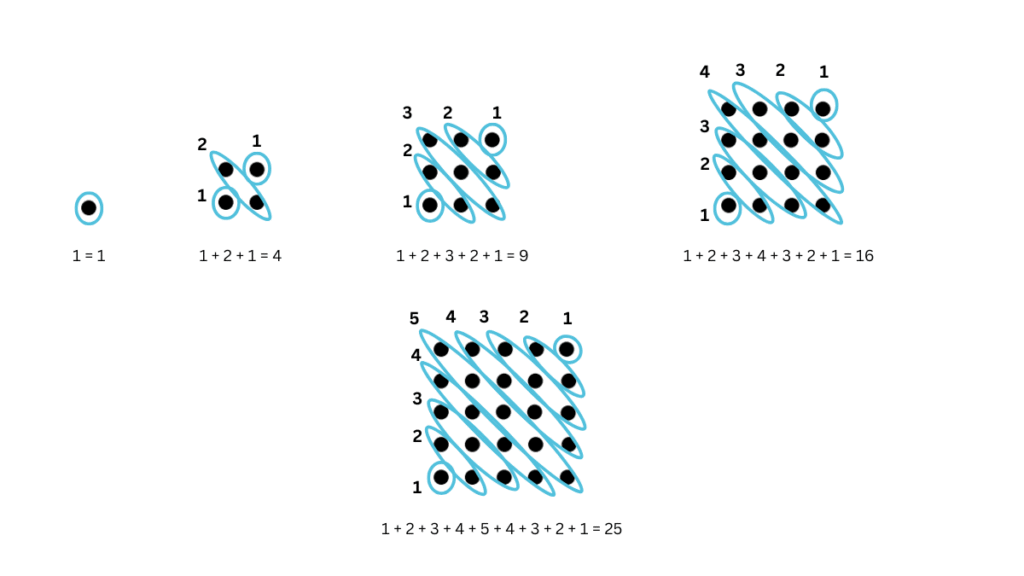 The sequence (1 + 2 + 3 + 4 + 5 + 4 + 3 + 2 + 1) forms a square with side length = 5.