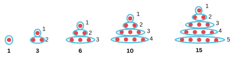 1, 3, 6, 10, 15, … are called triangular numbers because they can be arranged as dots in the form of equilateral triangles.