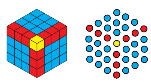 - In the third step, you add a hexagon of 19 dots, which forms a larger cube comprising of 27 smaller cubes. This larger cube has dimensions of 3 × 3 × 3.