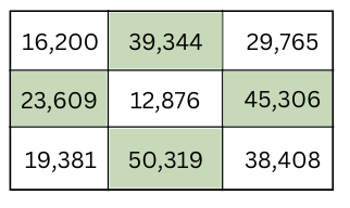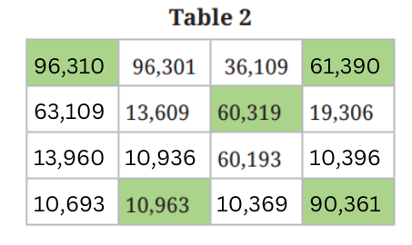 The completed Table 2with 5-digit numbers whose digits are ‘1’, ‘0’, ‘6’, ‘3’, and ‘9’ in some order and where only a coloured cell should have a number greater than all its neighbours is shown below: