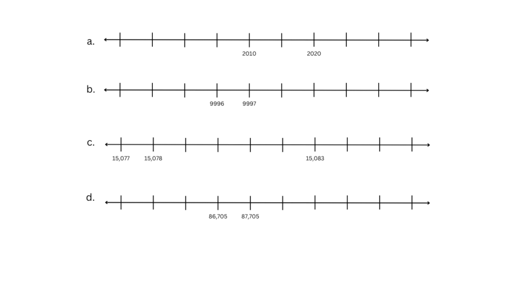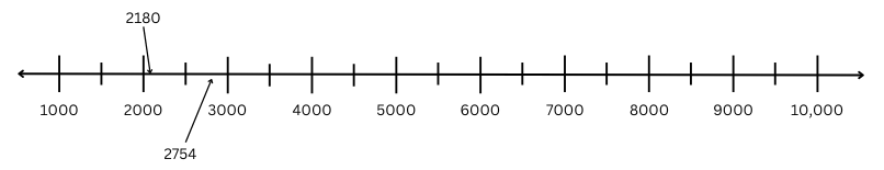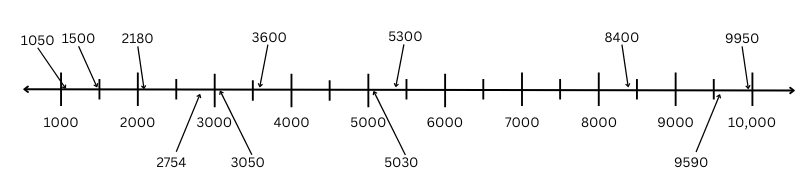We are quite familiar with number lines now. Let’s see if we can place some numbers in their appropriate positions on the number line. Here are the numbers: 2180, 2754, 1500, 3600, 9950, 9590, 1050, 3050, 5030, 5300 and 8400.