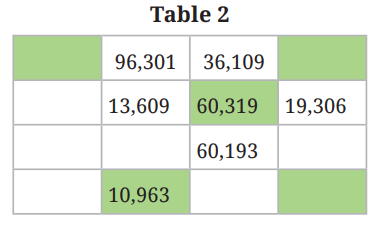 Complete Table 2 with 5-digit numbers whose digits are ‘1’, ‘0’, ‘6’, ‘3’, and ‘9’ in some order. Only a coloured cell should have a number greater than all its neighbours.