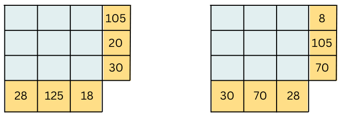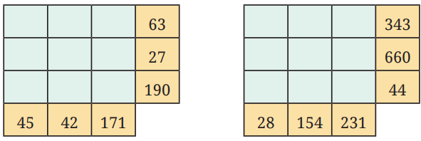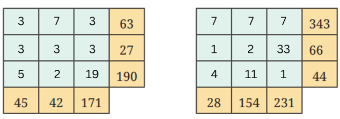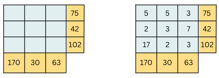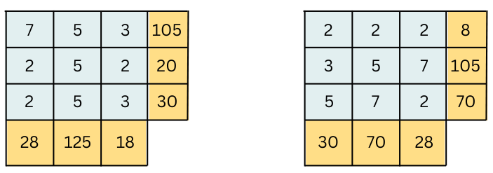 Rule: The product of each row is the number to the right of the row and the product of each column is the number below the column.