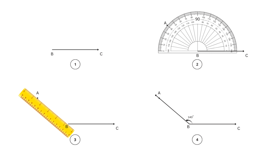 Step 3: Now, starting from 0, count your degrees up to 140o on the protractor. Mark point A at the label 140°.