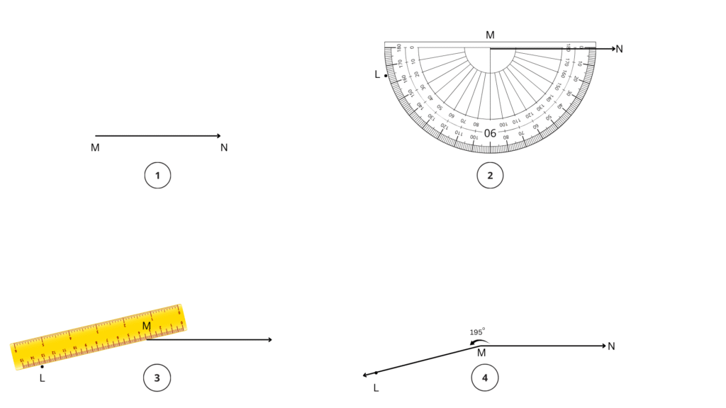 Step 4: Using a ruler join the points M and L. ∠NML = 195° is the required angle.
