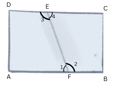 Angles formed between the fold and the sides of the paper are ∠AFE (marked by 1), ∠BFE (marked by 2), ∠DEF (marked by 3) and ∠CEF (marked by 4).