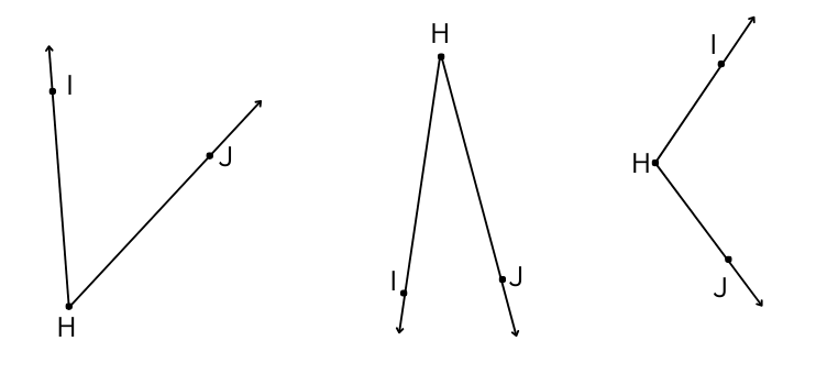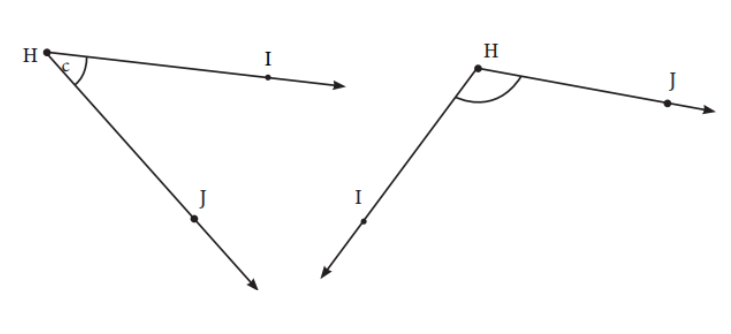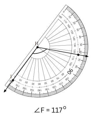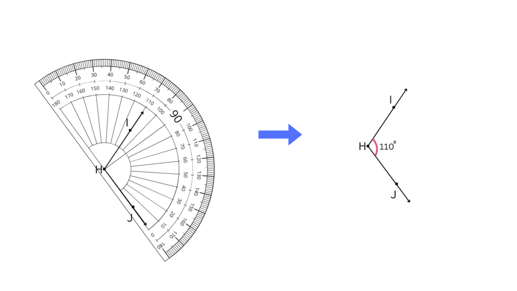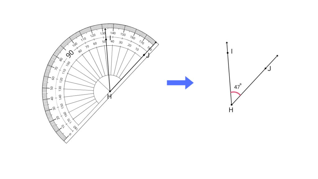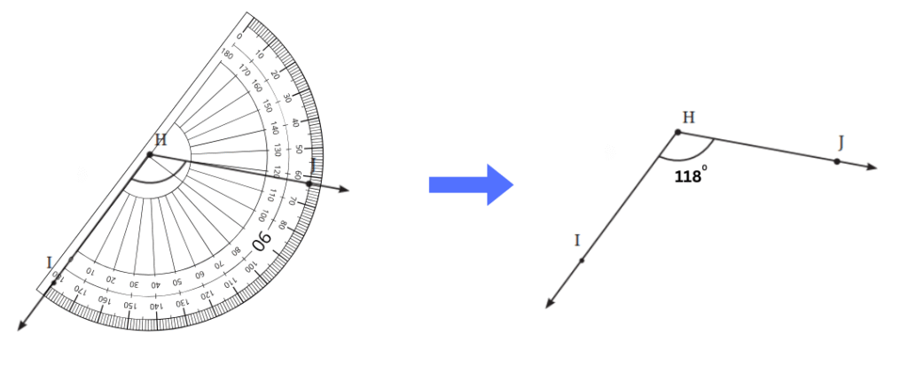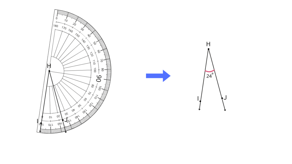 Step 2: We will place the centre point of the protractor on H and align HI to the 0 line.