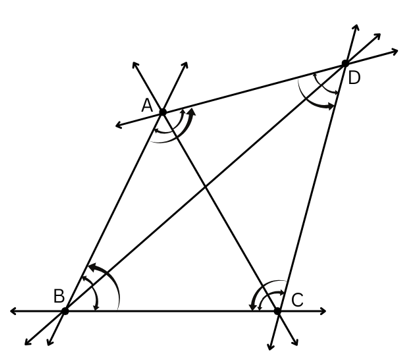 6. Now mark any four points on your paper so that no three of them are on one line. Label them A, B, C, D. Draw all possible lines going through pairs of these points. How many lines do you get? Name them. How many angles can you name using A, B, C, D? Write them all down, and mark each of them with a curve as in Fig. 2.9.