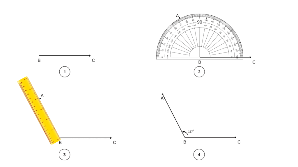 Step 8: Using a ruler join the point B and A. ∠ABC = 117° is the required angle.