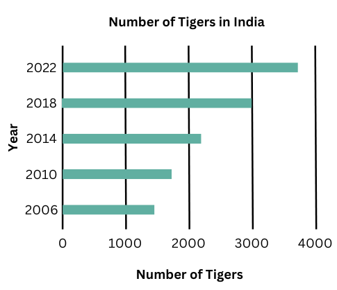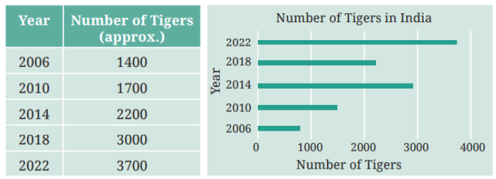 11. The number of tigers in India went down drastically between 1900 and 1970. Project Tiger was launched in 1973 to track and protect tigers in India. Starting in 2006, the exact number of tigers in India was tracked. Shagufta and Divya looked up information about the number of tigers in India between 2006 and 2022 in 4-year intervals. They prepared a frequency table for this data and a bar graph to present this data, but there are a few mistakes in the graph. Can you find those mistakes and fix them?