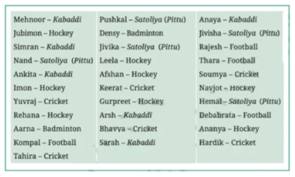 Naresh and Navya decided to go to each student in the class and ask what their favourite game is. Then they prepared a list.