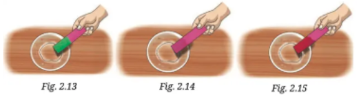 3. Observe and analyse Figs. 2.13, 2.14, and 2.15, in which red rose extract paper strips are used. Label the nature of solutions present in each of the containers.