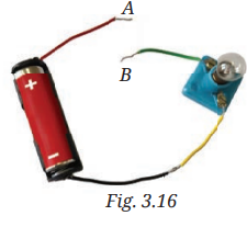 2. Observe Fig. 3.16. With which material connected between the ends A and B, the lamp will not glow?