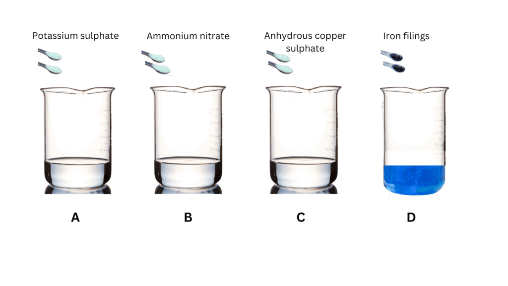 Add two spatulas of potassium sulphate, ammonium nitrate, anhydrous copper sulphate and fine iron fillings to beakers A, B, C and D respectively and stir.” – Solved.