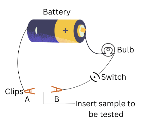 - Place the metal to be tested in the circuit between terminals A and B as shown.