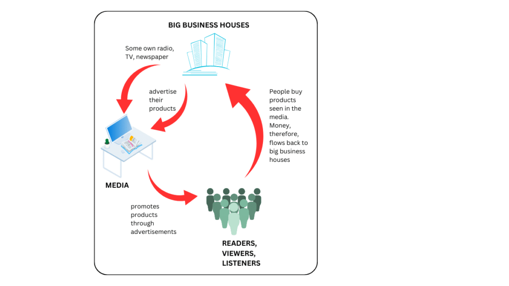 Big business Houses advertise their products through the media to lure the masses through attractive advertisements. The cost of marketing is factored in and raises the cost of goods, so the investment of the Big Businesses is ploughed back into their coffers when the public buys their goods. The media houses in turn earn handsome revenue through advertisements.
