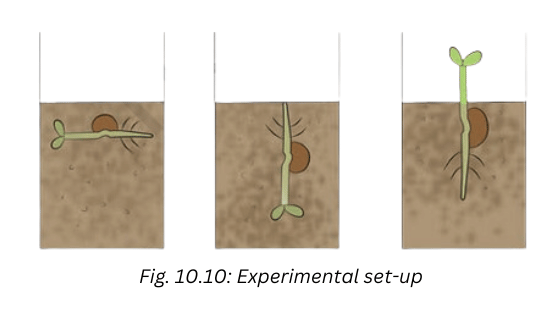 Left Pot (with horizontally planted seed): After 1 – 2 weeks, it is observed that the shoot bends upwards and grows towards the sunlight and the root bends down and grows away from the sunlight.