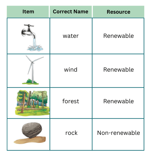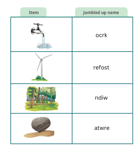 1. Fig. 11.9 shows items related to natural resources. Match them with their jumbled up names. Make another table and write the names of these resources. Classify these resources as renewable or non-renewable.