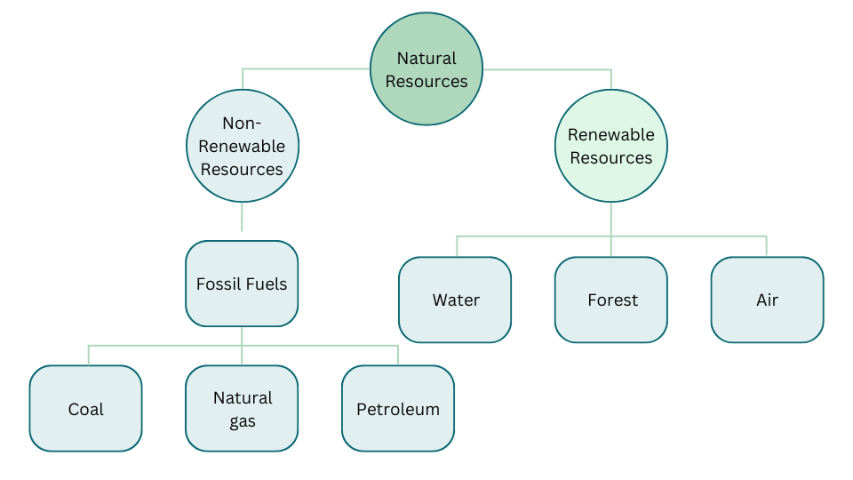 (fossil fuels, forest, air, petroleum, coal, water and non renewable resource)