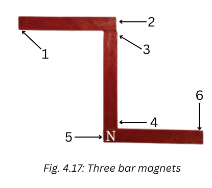 11. Three magnets are arranged on a table in the form of the shape shown in Fig. 4.17. What is the polarity, N or S, at the ends 1, 2, 3, 4 and 6 of the magnets? Polarity of one end (5) is given for you.