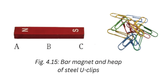 4. Atharv performed an experiment in which he took a bar magnet and rolled it over a heap of steel U-clips (Fig. 4.15).