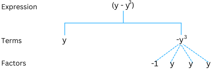 The term y cannot be factorised further. We factorise the term –y3 until it cannot be factorised further. Therefore, –y3 can be written as: (-1) × (y) × (y) × (y)