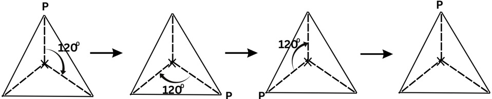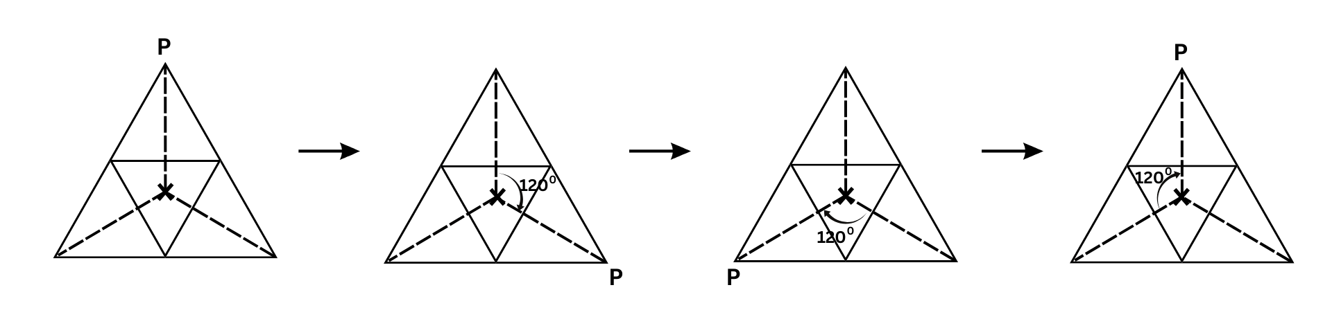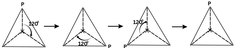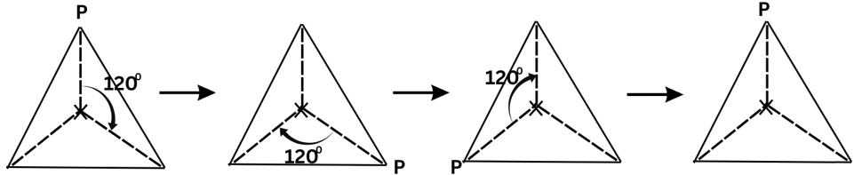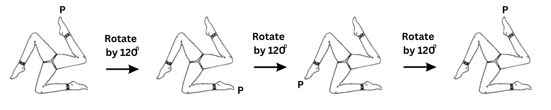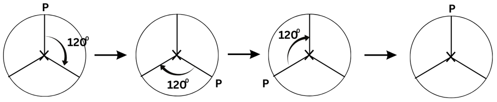 (b) We turn Figure (b) about the centre of rotation (marked with an X). In a full 3600 turn, there are precisely three positions (on rotation through the angles 1200, 2400 and 3600) when the figure looks exactly the same. Because of this, we can say that it has a rotational symmetry of order 3.