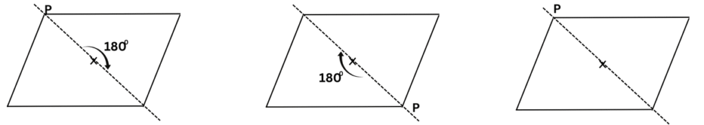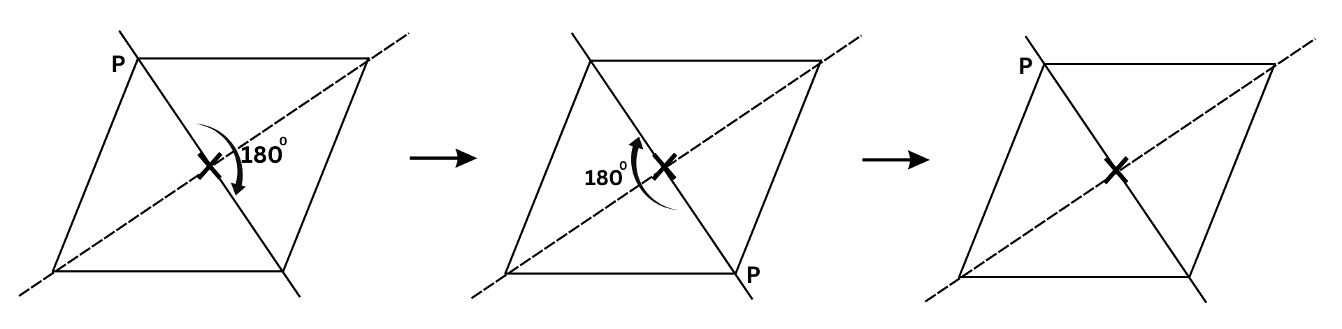 We turn the rhombus about the centre of rotation (marked with an X). In a full 3600 turn, there are precisely two positions (on rotation through the angles 1800 and 3600) when the figure looks exactly the same. Because of this, we can say that it has a rotational symmetry of order 2.