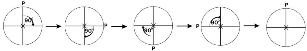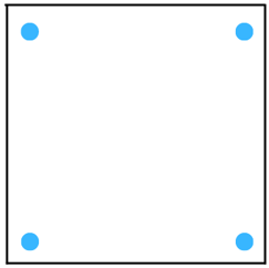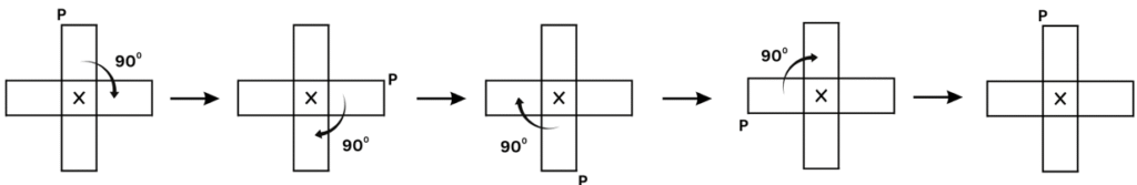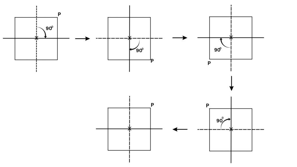 We turn the square about the centre of rotation (marked with an X). In a full 3600 turn, there are precisely four positions (on rotation through the angles 900, 1800, 2700 and 3600) when the figure looks exactly the same. Because of this, we can say that it has a rotational symmetry of order 4.