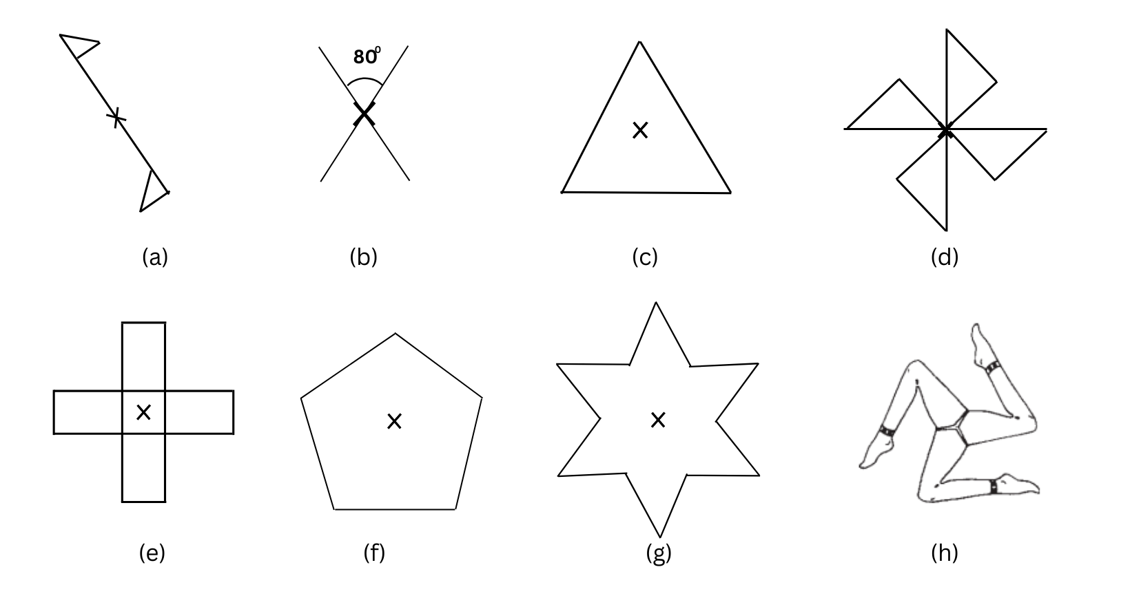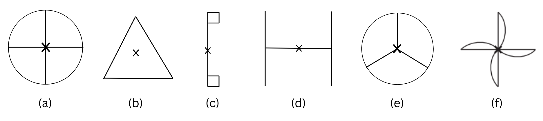 (e) We turn Figure (e) about the centre of rotation (marked with an X). In a full 3600 turn, there are precisely three positions (on rotation through the angles 1200, 2400 and 3600) when the figure looks exactly the same. Because of this, we can say that it has a rotational symmetry of order 3.
